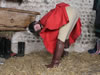 onto a chair in a shiny purple hooded mac and purple Hunter